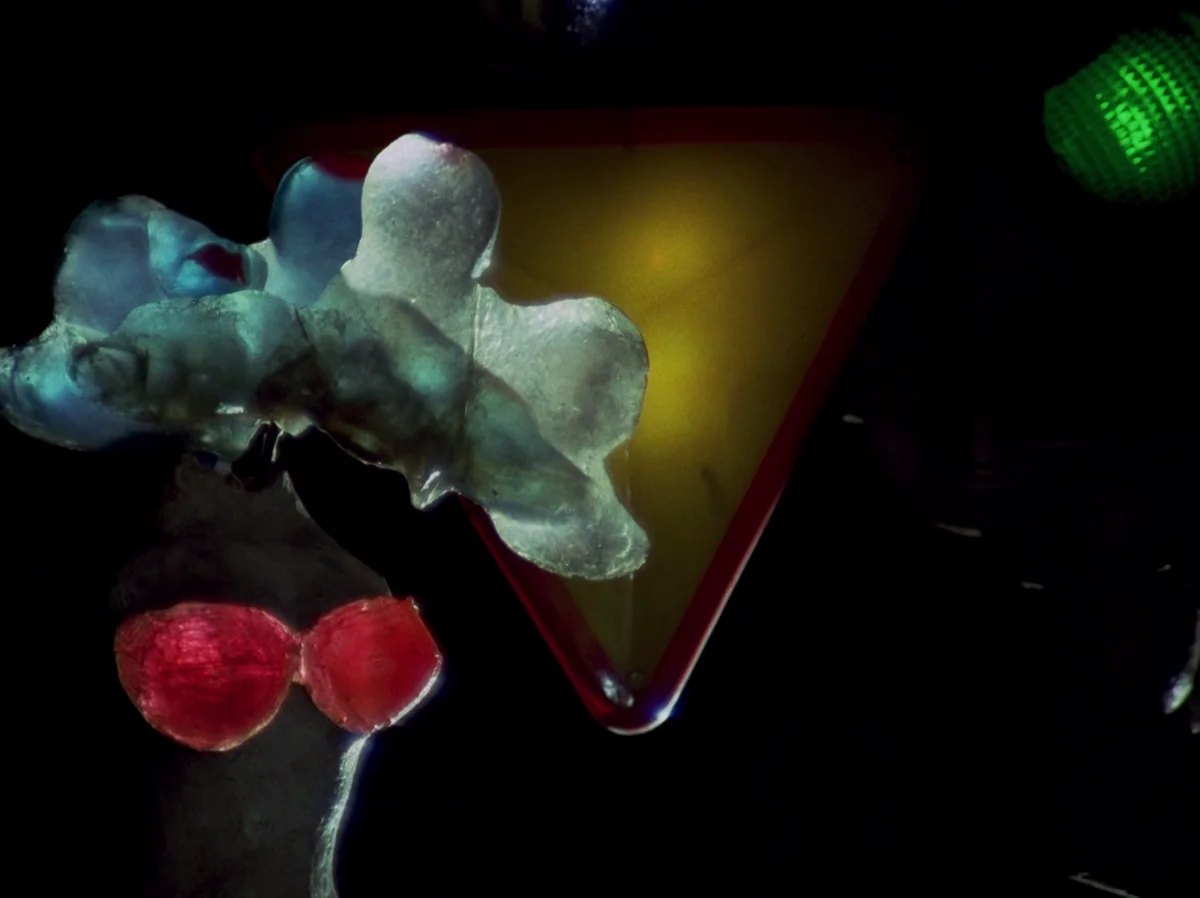 With the body and its scrutiny being so central to Szapocznikow’s thoughts, Włodarczyk’s exclusion of human actors or spectators is a notable admission. The shape of this absence becomes clearer when looking at the purposes a human observer might usually serve. In Witch’s Cradle (1944)*,* an early, unfinished Maya Deren film (co-directed with Marcel Duchamp), Pajorita Matta, a young girl with dark hair and a trailing white dress whose balletic curiosity prefigures the way Angela Carter would set her heroines moving within the invisible pentacles of their own virginities, wanders around Peggy Guggenheim’s New York gallery at night. Just as we know from Szapocznikow’s grimace that the rock she’s sculpting is brittle, Matta’s wonderful slack-jawed deviancy suggests that Guggenheim’s collection possesses all kinds of occult and prohibited power. Not every choreographed encounter affirms the artwork’s power; the human observer can throw doubt on it, too. Duchamp’s work appears again in the short film, Through the Large Glass (1976)*,* by the artist Hannah Wilkes. Standing behind his stained glass work, The Bride Stripped Bare by Her Bachelors, Even (1915-23), Wilkes strips and poses, covering and uncovering herself with the artwork’s opaque corners, squaring up Duchamp’s reality against her own. In both films, the observers mime the affective and aesthetic power the artworks have on them so we can sense the pull they exert, their strange entropy. We learn about artworks from the way they affect the body of the observer on screen, and how those affects can be embraced or combatted. Without human observers, the artworks are suddenly less obviously affective objects. The sculptures, alone in the city, moving, wounded, and searching, become affected bodies themselves. It’s their journey, their Bildung, their life.