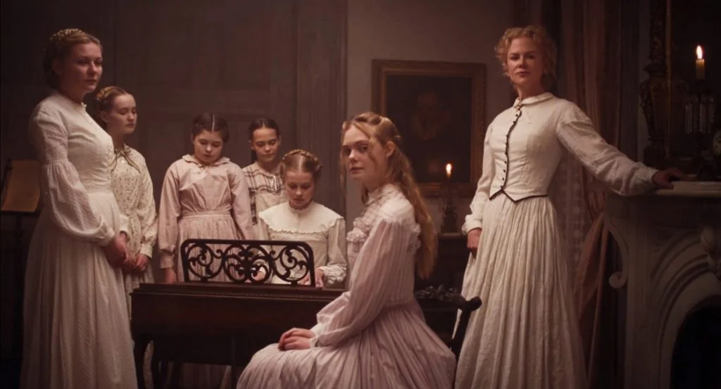 Now, with The Beguiled, the gothic impulse that lies below the dreamy, flower-filled meadows of The Virgin Suicides, neon lit exoticism of Lost in Translation’s Tokyo, or raucous, champagne fuelled parties held either in Versailles or Paris Hilton’s mansion (Marie Antoinette, The Bling Ring) is given full expression, as if finally – finally! – Coppola is letting her girls get violent. Whereas previous films, whatever their considerable differences in genre, feel, and atmosphere, have shown us a potential female rebellion that is stifled variously by acquiring things or committing suicide, so that the overall impression is one of torpor and languor, here is a promise that finally we’ll get a properly gothic, blood soaked Coppola that acknowledges and even welcomes female anger. Is this a sign that Coppola is finding more confidence in a more overt feminist politics? While earlier films were never blind to gender injustice, from the treatment of Marie Antoinette as human incubator for French royalty to the sexual double standard that policed the Lisbon girls (The Virgin Suicides), her films retained a strangely muted tone where girls carved out alternative spaces for their pleasure (music, parties, fashion) and tried their best to find their place in the world, even while chafing against its conventions. Now, women are vengeful bitches, castrating demons, lashing out against the world and its demands. The Beguiled offers a portrait of feminine world-making with a new gory twist. It reprises Coppola’s close attention to adolescent girlhood and asks again how girls grow into women in a world that cherishes feminine innocence but condemns, or at least contains, feminine desire. Can one exist as a fully desiring adult female in Coppola’s world? What price must be paid?