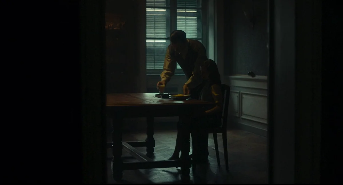 Mia’s difficulty with words is matched by the few words of her keeper, Albert Scellinc (Paul Hilton), a man unable to escape his past. Albert and Mia reside in a large house where he keeps the windows shuttered at all times. Their glass seems to torment Albert, allowing light to be shed on a dismal present. In another form, glass fascinates and haunts him: he keeps a cabinet of fine glassware in the house, taking pieces out from time to time to marvel at them. This is one of few pleasures Albert allows himself, alongside a long drag on a cigarette after dinner. Yet when these glasses catch what scant light there is in the tenebrous interiors of the house, the refractions dazzle and transport him, again, back to his past.