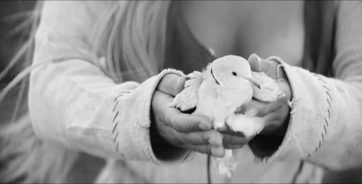 Vláčil __ is preoccupied with animal life and uses these lives within the greater project of the film’s symbolism. They are made to represent the paganism of the older world, their fluid, untrammelled existence a neat contrast to the geometric severity of the convent to which Marketa flees; the inexorable nature of the law that the Hejtman follows. In his essay on Marketa Lazarová, Peter Hames describes how “[t]he closing door of the convent contrasts with the fleeing of a deer, the shape of the building with the disorderly flight of the birds.”Peter Hames, The Cinema of Central Europe (Wallflower Press, 2004), p. 155 The animals are burdened with meaning, overdetermined: in many cases, they are made to carry the characters too. There’s a mouse and a dove for Marketa, whereas Mikoláš, the man who abducts her, is associated with wolves – later, he is given the quick savagery of the hawk; the taciturn majesty of a stag. (If the gendering of these associations is dated, the parallel between the treatment that both the mouse and Marketa receive is not.) When Kristián, their German captive, is separated from his lover Alexandra, his madness is figured through a white horse sinking into the marsh. The suffering of the horse – his struggle – mirrors that of Kristian.