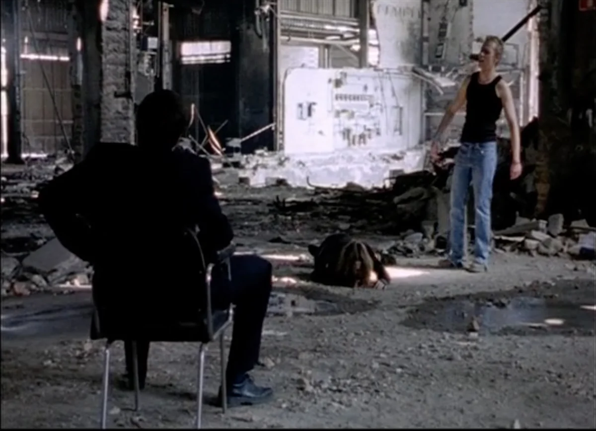 No Love Lost opens on an abandoned factory, or industrial space. Blood on the concrete floor and the sound of violence off-screen. The back of a blonde torso flicks in and out of view, smacking down methodically. Neither the sound heard nor the body shown can be attached to a gender, and the viewer is even unsure which limbs belong to which bodies. There are long pauses where the screen goes dark and only the sounds of grunts and impact can be heard. A fight scene without the fight: just sounds, flickering images of limbs and hair. Finally, the camera pauses on the face of a woman, her face bloodied, peering up through her hair at her attacker. A moment later the shot pans back to reveal a third figure in the factory. A man in a black suit and shiny shoes sits nearby, his back to the audience, masturbating furiously to the sight of the woman breathing heavily on the concrete. The man who has been beating her stands back, recovering from his exertions. As the masturbating man finishes, the aggressor turns away and begins to retch, throwing up into a pile of disused car parts.