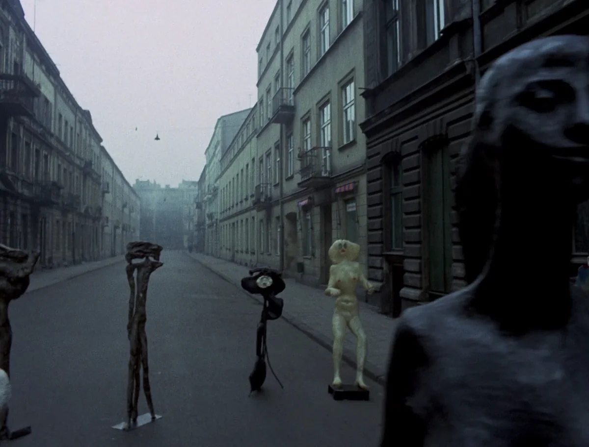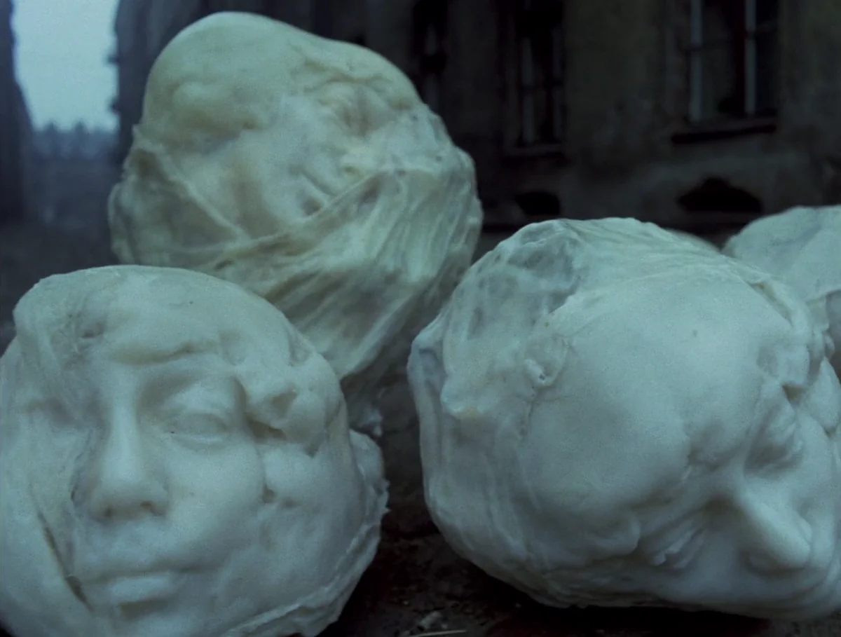 In many ways, Ślad ’s eschewal of typical biographical tropes is a consequence of the film’s focus on the body. There’s not much to go on that isn’t Szapocznikow’s body at work or her body of work, or the way in which the two collide. The latter is a theme that Włodarczyk herself would have encountered when she saw Szapocznikow’s retrospective at Lodz, two years after the artist’s early death at the age of 46. Szapocznikow drew from her own body and those of her friends and family; she turned Julie Christie’s lips into vermicular lamps, carved Arianne Raoul-Auval’s belly in high-quality Carrara marble and mounted a flayed and crumpled life cast of her son onto a wooden frame. “My gesture is addressed to the human body,” Szapocznikow wrote, “to praise the impermanence in the recesses of our body, in the traces of our steps on the ground.”Alina Szapocznikow, untitled artist’s statement, 1972, [https://artmuseum.pl/en/archiwum/archiwum-aliny-szapocznikow/104/7330]. Włodarczyk plays a recording of this statement over the film’s central sequence, which explores our impermanence and the traces we leave behind by way of an unnamed and depopulated European city and the strange figures that inhabit it. A group of Szapocznikow’s works congregate in an empty street, looking as if they’ve just spilled out of the houses and have come together to discuss a still cooling crisis. If they were citizens, you would assume that an ambulance had just left. The city the sculptures occupy is not an open-air museum of galvanised art, but a devastated remnant: a liquidated ghetto, a memorial of nuclear shadows; a space that seems frozen in the moment of its final catastrophe. It’s possible to see elements of Szapocznikow’s own childhood in the desolate city: the artist was ghettoised with her family when she was 13, and later incarcerated in Auschwitz and Bergen-Belsen. Although she rarely spoke about the camps, her vision of the human body as “the only source of all joy, all suffering and all truth” stands as an affirmation of the unnegotiable value of life.Ibid. No body more meaningful than another, none closer to truth.