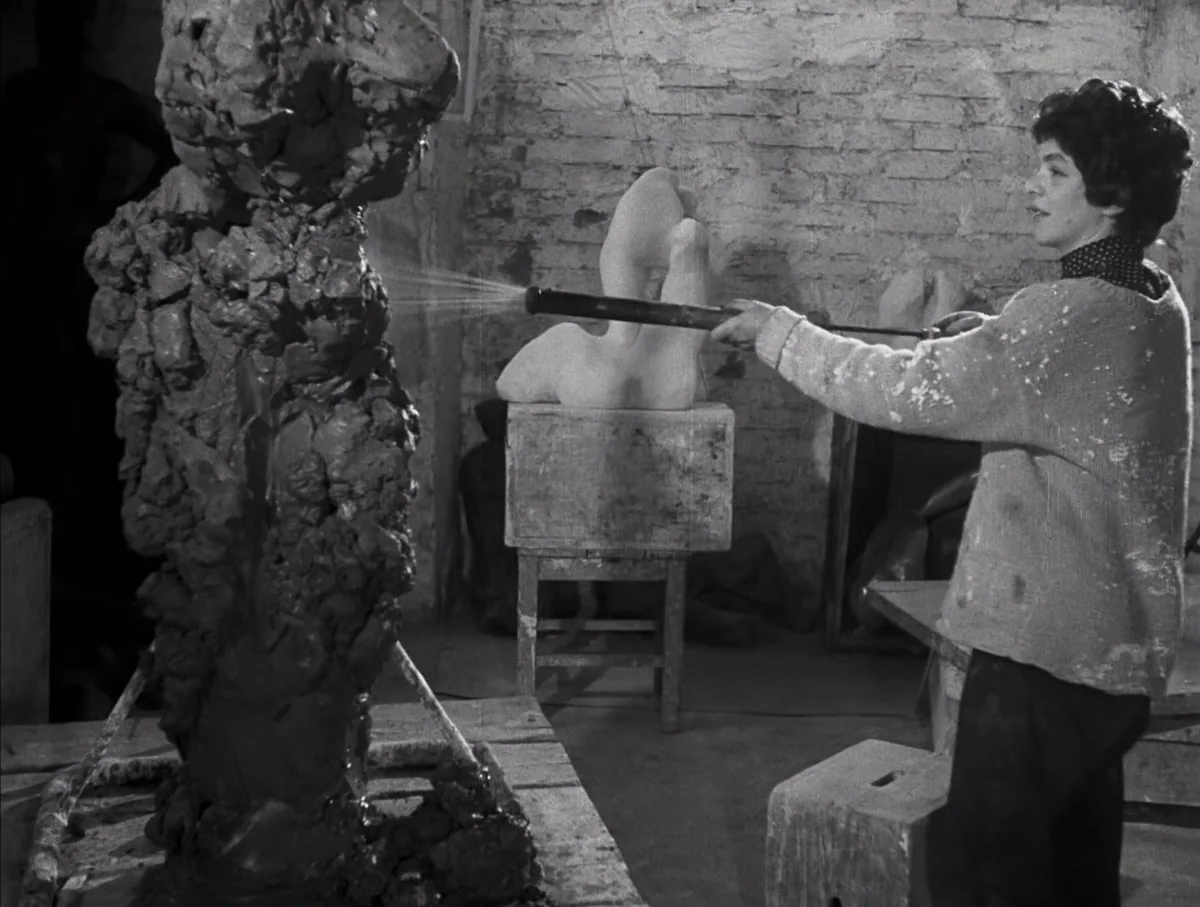 In the opening moments of Hanka Włodarczyk’s film Ślad (1976), the Polish artist Alina Szapocznikow (1926–1973) takes a hammer and chisel to a rough sculpture with a sure, quick hand. We can’t see the chunks of stone flying away but because of the way Szapocznikow reacts we infer that they do – every so often, she flinches. Next the scene shifts to an exhibition opening where Szapocznikow, dressed in silvery animal print, accepts a bouquet of lilacs. Then she’s back in the studio slapping clay onto the crotch of a composite female figure with a wooden panel. Chiselling, charming, chiselling again, rubbing shoulders and hosing down clay: the back-and-forth swing between the studio and the gallery splits artistic labour into two modes: the social and the creative. It’s the former I find fascinating. I like to watch a celebrated woman working a crowd. The torturous oddity of historical female creativity is so engrained in the cultural consciousness that sometimes it’s easy to forget that the mechanism of rediscovery kicks in precisely because these women spent a good portion of their lives receiving awards and having roses tossed at their feet. By showing us the artist caught up in both types of work – making art and building a reputation – Włodarczyk skips over questions of inspiration and motivation. She doesn’t invite us to wonder what dark corner this art making impulse might have come from and we never learn why Szapocznikow is doing what she’s doing, only that she’s doing it rather well. Perhaps, Włodarczyk implies, it is none of our business.