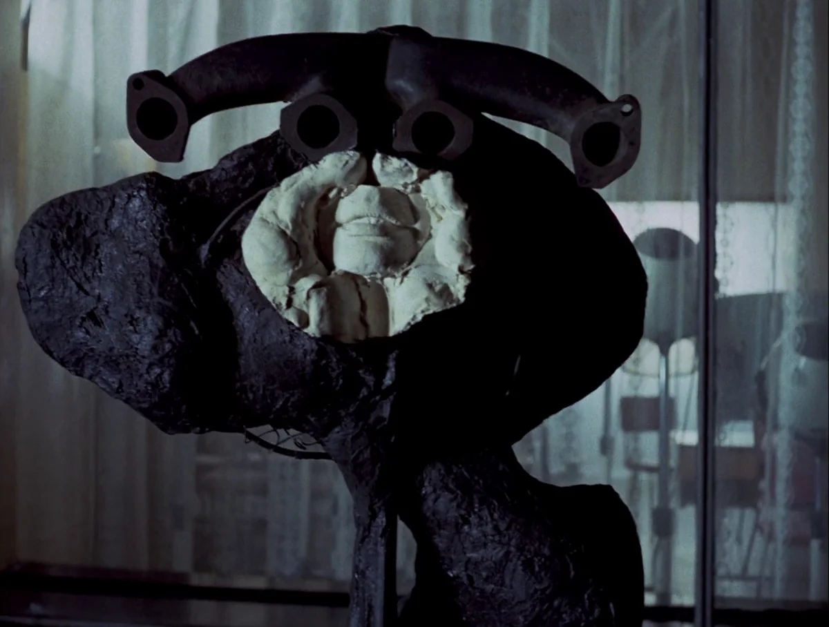 With the body and its scrutiny being so central to Szapocznikow’s thoughts, Włodarczyk’s exclusion of human actors or spectators is a notable admission. The shape of this absence becomes clearer when looking at the purposes a human observer might usually serve. In Witch’s Cradle (1944)*,* an early, unfinished Maya Deren film (co-directed with Marcel Duchamp), Pajorita Matta, a young girl with dark hair and a trailing white dress whose balletic curiosity prefigures the way Angela Carter would set her heroines moving within the invisible pentacles of their own virginities, wanders around Peggy Guggenheim’s New York gallery at night. Just as we know from Szapocznikow’s grimace that the rock she’s sculpting is brittle, Matta’s wonderful slack-jawed deviancy suggests that Guggenheim’s collection possesses all kinds of occult and prohibited power. Not every choreographed encounter affirms the artwork’s power; the human observer can throw doubt on it, too. Duchamp’s work appears again in the short film, Through the Large Glass (1976)*,* by the artist Hannah Wilkes. Standing behind his stained glass work, The Bride Stripped Bare by Her Bachelors, Even (1915-23), Wilkes strips and poses, covering and uncovering herself with the artwork’s opaque corners, squaring up Duchamp’s reality against her own. In both films, the observers mime the affective and aesthetic power the artworks have on them so we can sense the pull they exert, their strange entropy. We learn about artworks from the way they affect the body of the observer on screen, and how those affects can be embraced or combatted. Without human observers, the artworks are suddenly less obviously affective objects. The sculptures, alone in the city, moving, wounded, and searching, become affected bodies themselves. It’s their journey, their Bildung, their life.