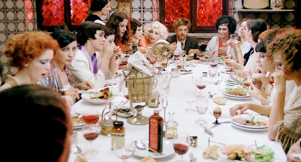 In Love and Anarchy the brothel is the only creative space; hybrid, sub-public. It is a site of worker-consumer relations that resists the apparatuses and ideology of fascist Italy, the locus of the film’s action. Its interior, a shadowy theatrical site of performance, spectacle, and artifice, is a foil to the sparsely populated exterior spaces of Rome, littered with fascist monuments and rationalist architecture signalling imperial glory, reason, and the victorious past of Ancient Rome. The brothel and its performances abound with irony and parody; the prostitutes are bawdy and extreme; their costumes are opulent, fashionable, and their make-up heavy. In a musical montage, we see the women of the bordello strut around the living room, hoping to entice customers. As ‘La Petite Tonkinoise’ plays, each prostitute descends the stairwell and enters the room, winking at the infatuated men. Wertmüller’s camera objectifies their bodies: they are split up, reduced to body parts, their commodified sexuality on display to both the johns and the audience. She cuts off their faces, and at one point shows an entire row of nude torsos. The close focus on their pearls and various adornments is a scopophilic fragmentation that would make classic Hollywood proud. But Wertmüller’s carnivalesque visual language is a parody of this urge, and manipulates the spectator into an awareness of their voyeurismDiaconescu-Blumenfeld, Regista di Clausura: Lina Wertmüller and Her Feminism of Despair, p. 391. As the camera moves between the stupefied ogling of the johns and the energetic, calculating eyeballing of the prostitutes, Wertmüller attributes dynamism, energy, and imagination to the women. They appear to revel in the theatricality and their vigour stands in sharp contrast to the mens’ passive prurience. In their vaudeville performance they initially appear as objects of vision which we view as voyeurs, yet as the performance progresses our gaze increasingly identifies them as with energy and action. Although initially complicit with the johns, the spectator’s identification ends up with the prostitutes. This transition is alienating in that it forces an awareness of oneself as spectator, as active participants of political meaning-making. It is here that Wertmüller is at her most potent.