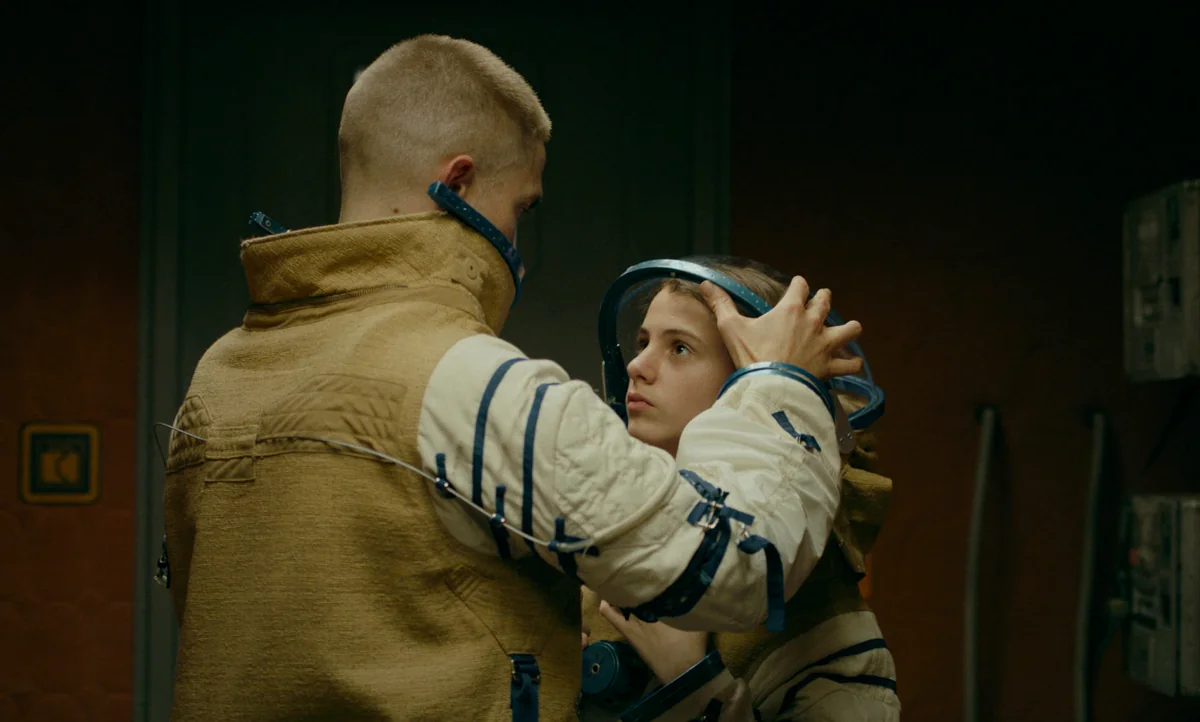 In voice-over, Monte recalls how the prisoners were described as “scum” and “vagabonds”, pictured in a delirious flashback of a dirt-stained Boyse train hopping. For a science fiction film set in space, with a decidedly clinical focus (Dr. Dibs not only works on reproduction, but monitors vital signs and administers drugs), there is a palpable sense of dirt and decay – a kind of deterioration which approximates the exploitation of these prisoners, the forced duration that exceeds human timelines. From the outside, the spaceship resembles a floating shipping container. Inside, fluids (soap, blood, cum, milk) leak and cryogenic vapour escapes into the corridor. The medical equipment looks outdated and at times DIY, while Dr. Dibs is shown administering a needle in a ragged, oversized hoodie. There is also a dirtiness to the film’s superb score and sound design (led by Denis regular Stuart A. Staples of Tindersticks), in the way that music and the background ambience of the spaceship (a continuous radiating hum) fold into and mingle with the materiality of sound effects, such as the bubble and gurgle of a water-recycling system or the hiss of cryogenic vapour escaping from the chamber. On the television screen, an image of someone entering the ocean begins to glitch. A passing forest, shot through a train window, becomes an abstract blur of grey shifting lines. Near the end of the film, Monte and Willow come across an identical spaceship, dark and overrun with dogs, some rabid, some dead.