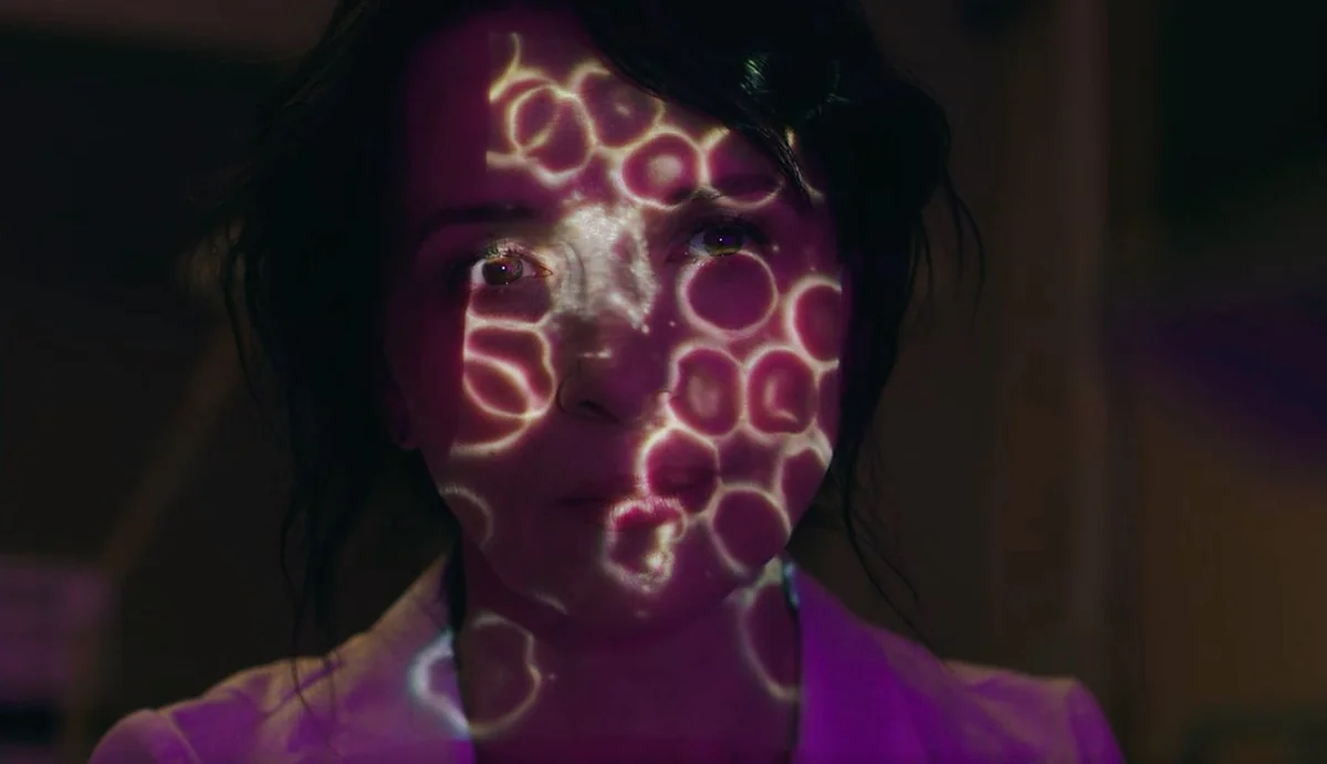 The timeline of High Life is somewhat opaque, as if the viewer is caught in the diverging temporalities of the prisoners in space and those they’ve left back on Earth. When the viewer first encounters the other prisoners, they are already dead, preserved in a cryogenic chamber. This takes power, and so Monte shuts down the chamber. A wordless, intricately-choreographed sequence shows him dressing the prisoners in their spacesuits. As he carries each body across the floor and jettisons them off the spaceship, only the sounds of him shifting under their weight and his laboured breathing are audible. The isolation of these bodily sounds underscores Monte’s (and Willow’s) abandonment. He stands in the illuminated doorway of the spaceship, and the film cuts to a striking image of the prisoners’ bodies as they fall, moving slowly away through star-filled black. What then follows is an extended flashback set four years into their mission, tracing the chain of events that has led to Willow’s conception, and father and daughter’s radical mutual dependence. This opens with Boyse, soon to become Willow’s biological mother, as she carves into the wall of the spaceship with broken glass. Monte attempts to restrain her and she attacks him with the glass. Afterwards, Dr. Dibs (Juliette Binoche with hip-grazing hair) dresses Monte’s wound; while Boyse looks on, criticising Dr. Dibs’s treatment of a pregnant prisoner, Elektra (Gloria Obianyo). The next scene shows Dr. Dibs collecting sperm from the other male prisoners: Captain Chandra (Lars Eidinger), Tcherny (André Benjamin), and Ettore (Ewan Mitchell). In the futureless world of High Life, relationality – the focus on human relationships, especially those of kinship – has been transformed by reproductive experiments beyond the prisoners’ control. The film extends its focus on extractive economies and incarceration to control over bodies, especially those of women and particularly those of black women, via sex and reproduction. Elektra is the first prisoner to die due to pregnancy complications, to which Tcherny remarks “even up here, black ones are the first to go.”